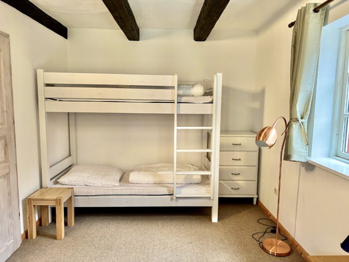 In den Schlafzimmern befindet sich jeweils ein Doppelbett. Im großen Schlafzimmer findet sich ein ergänzendes Stockbett, welches bei Bedarf auch für Erwachsene geeignet ist. Die Unterbringung von Kleinkindern im mitgebrachten Babybett ist möglich.